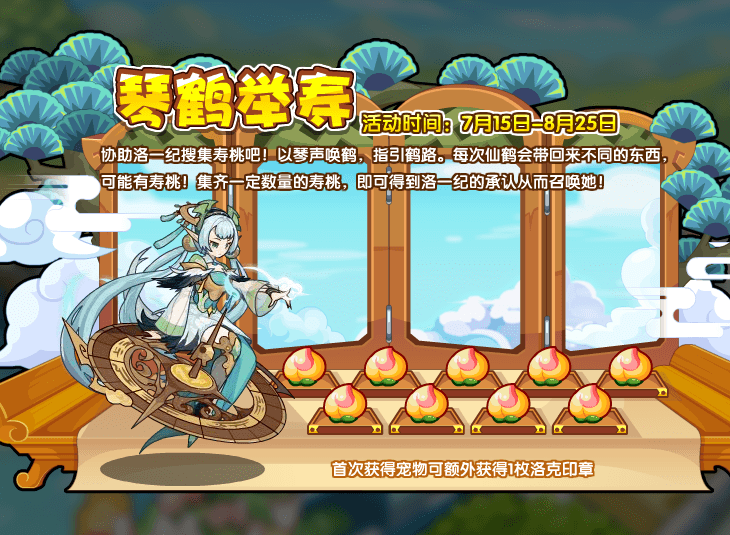 协助洛一纪搜集寿桃吧!以琴声唤鹤,指引鹤路。每次仙鹤会带回来不同的东西,可能有寿桃!集齐一定数量的寿桃,即可得到洛一纪的承认从而召唤她!