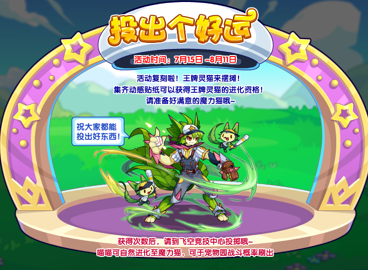 活动复刻~和王牌灵猫一起投球吧!集齐动感贴纸即可获得进化资格!请先准备满级的魔力猫哦~