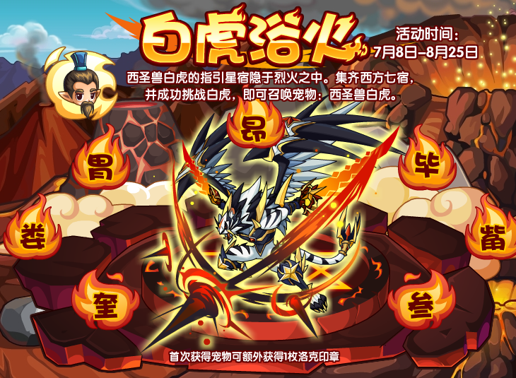 西圣兽白虎的指引星宿隐于烈火之中。集齐西方七宿,并成功挑战白虎,即可召唤宠物:西圣兽白虎。