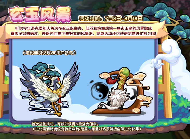 听说今年洛克周年庆首次在玄玉岛举办,仙羽和笔童准备想拍一些玄玉岛的风景做成宣传纪念明信片,去帮它们拍下些好看的风景吧。完成活动还可获得宠物进化机会哦!