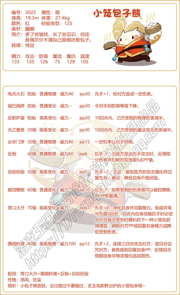 洛克王国游戏中小笼包子熊即将上线,这个宠物怎么样,厉害吗?今天手游网小编珞珞就给大家带来了《洛克王国》小笼包子熊技能表图鉴介绍,感兴趣的速来围观吧!