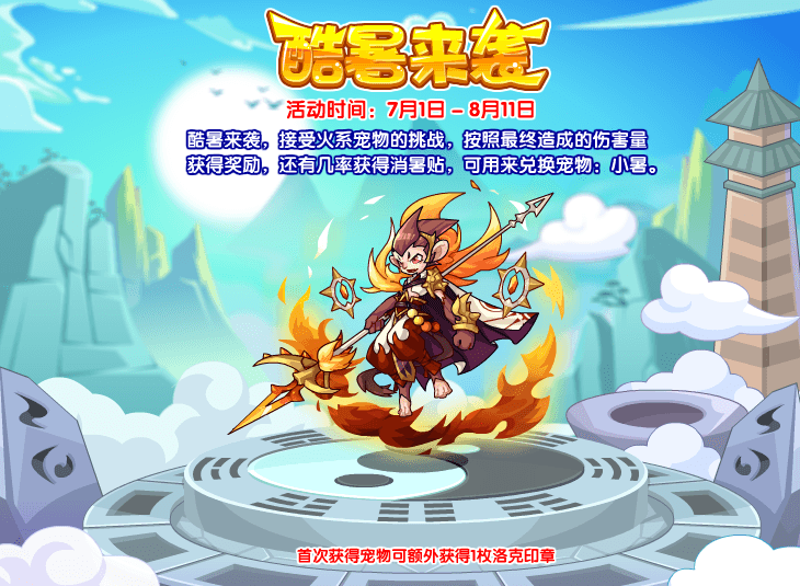 7月1日-8月11日参见酷暑来袭活动,接受火系宠物的挑战,按照最终造成的伤害量获得奖励,还有几率获得消暑贴,可用来兑换宠物:小暑。