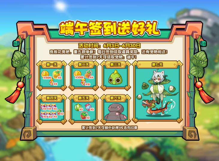 良辰花竞艳,重五粽争新!每日签到领取道具奖励,还有宠物相送!累计签到7天可领取宠物:端午!