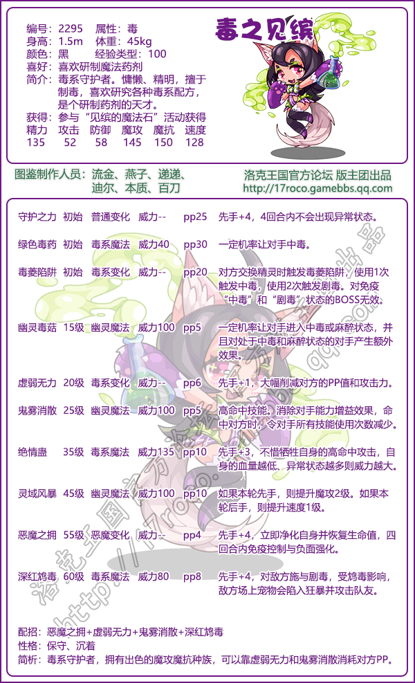 毒之见缤编号为2295,它是一种拥有着毒系属性的精灵,喜欢研制魔法药剂。