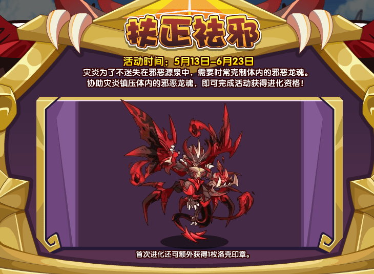 灾炎为了不迷失在邪恶源泉中,需要时常克制体内的邪恶龙魂。协助灾炎镇压体内的邪恶龙魂,即可完成活动获得进化资格!