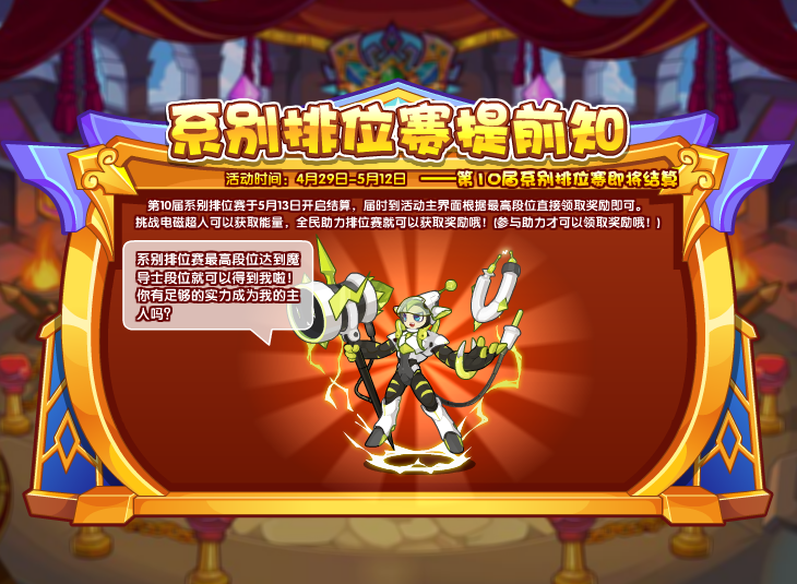 第10届系别排位赛于5月13日开启结算,届时到活动主界面根据最高段位直接领取奖励即可。挑战电磁超人可以获取能量,全民助力排位赛就可以获取奖励哦!