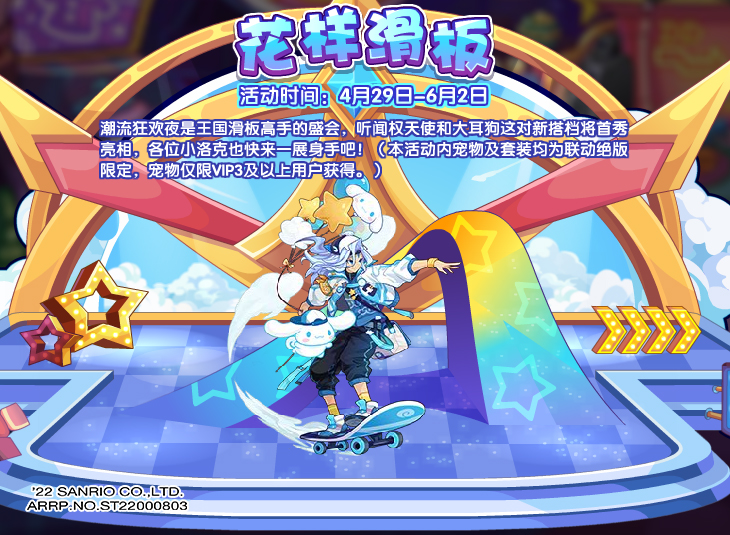 潮流狂欢夜是王国滑板高手的盛会,听闻权天使和大耳狗这对新搭档将首秀亮相,各位小洛克也快来一展身手吧!(宠物仅限VIP3及以上用户获得。)