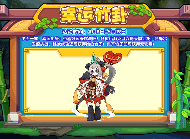红桃红桃,幸运加身!带着好运来挑战吧!各位小洛克可以每天向红桃门特梅尔发起挑战,挑战成功还可获得她的竹子!集齐竹子即可获得宠物哦!
