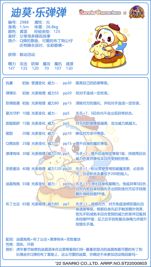 迪莫乐弹弹从种族值来看是一个物攻宠物,不过强度不是很高,主要是作为收藏的。