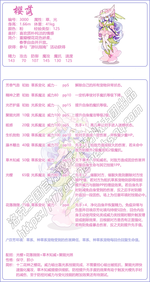 洛克王国游戏宠物编号3000宠物是我们唯美的十二花神之一的樱落,这个宠物怎么样,厉害吗?下面手游网小编珞珞就给大家带来了《洛克王国》樱落技能表图鉴介绍,感兴趣的速来围观吧!