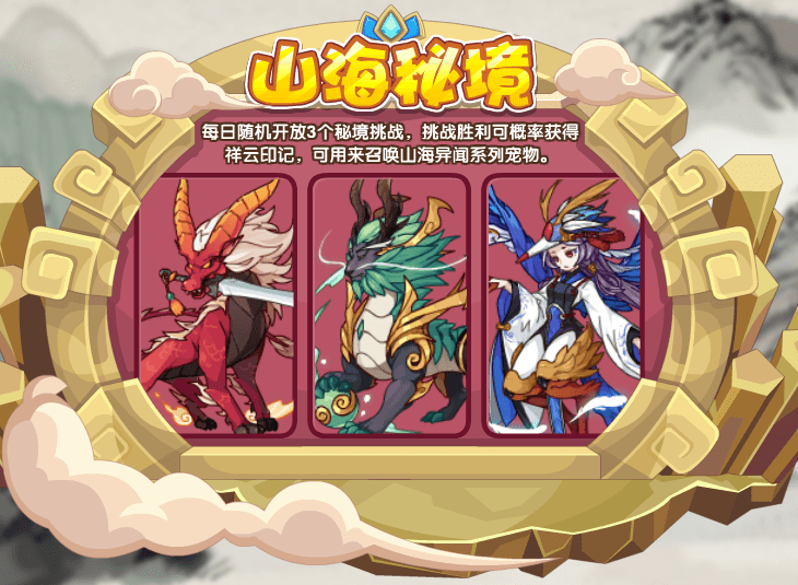 五方之山,八方之海,珍宝奇物异方之所生,麟凤之所止,祯祥之所隐,四海之外,殊类之人境也。探索藏着山海异闻之秘境,挑战胜利可概率获得祥云印记,印记可用来召唤山海异闻系列宠物。