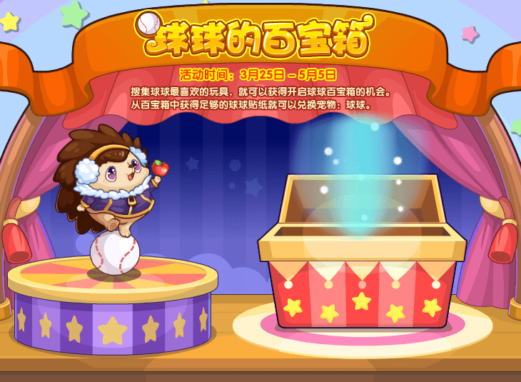 搜集球球最喜欢的玩具,就可以获得开启球球百宝箱的机会。从百宝箱中获得足够的球球贴纸就可以兑换宠物:球球。