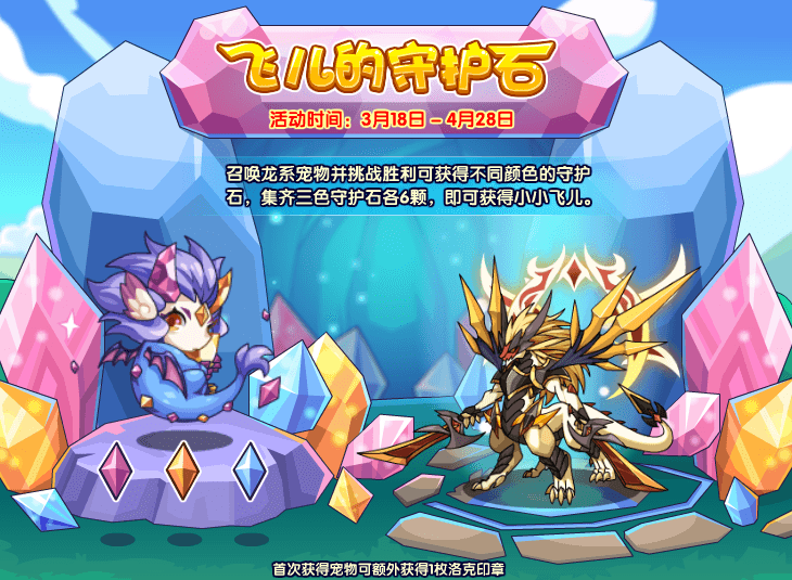 召唤龙系宠物并挑战胜利可获得不同颜色的守护石,集齐三色守护石各6颗,即可获得小小飞儿。