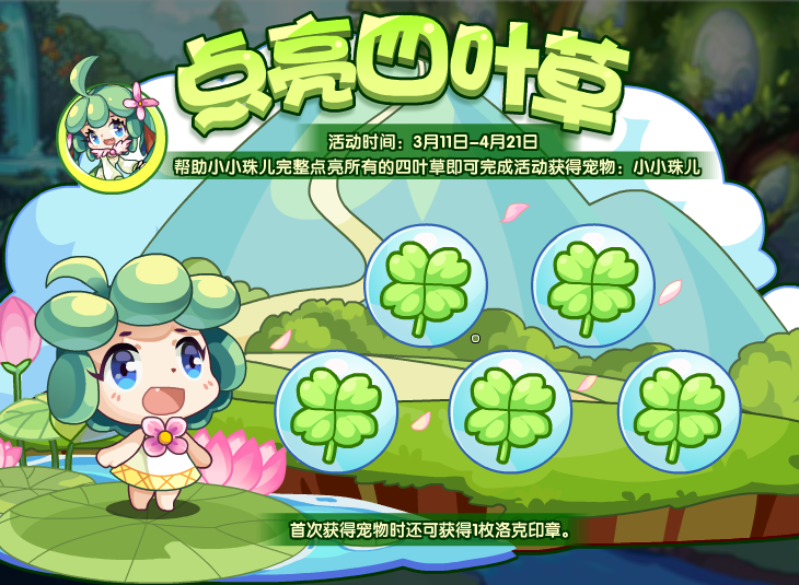 帮助小小珠儿完整点亮所有的四叶草即可完成活动获得宠物:小小珠儿。