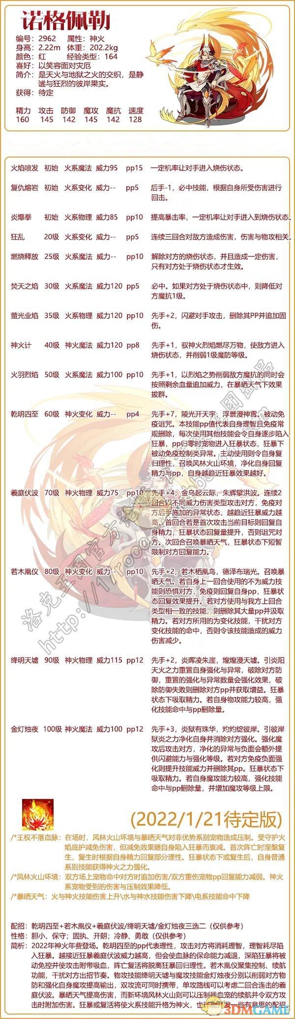 4、简析:2022年神火年费登场。干明四至的pp代表理性,攻击对方将消耗理智,理智耗尽陷入狂暴。越接近狂暴羲庭伏波威力越高,但会使血脉的保命能力减退,深陷狂暴将被动免控并使攻击附带吸血,阵亡复活将脱离狂暴回归理性。若木凰仪聚集控制、续航功能,干扰对方岀招节奏。物攻技能绛明夭墟与魔攻技能金灯烛夜分别以削弱对方物防和强化自身魔攻提高输出,双攻流可同时携带,单攻路线可以考虑二回合连击的羲庭伏波。暴晒天气提髙伤害,而新环境风林火山则可以压制残血宠的续航并令双方攻击时附加伤害。狂暴或复活将使火系技能升格为神火,也许能开发一些有意思的配招。