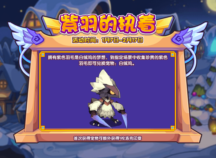 《洛克王国》游戏中参加2022年1月7日-2月17日上线的【紫羽的执着】,拥有紫色羽毛是白绒鸡的梦想,到指定场景中收集珍贵的紫色羽毛即可兑换宠物:白绒鸡。
