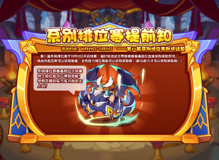 第八届系别排位赛于11月12日开启结算,届时到活动主界面根据最高段位直接领取奖励即可。挑战究极瓦斯可以获取能量,全民助力排位赛就可以获取奖励哦!(参与助力才可以领取奖励哦!)