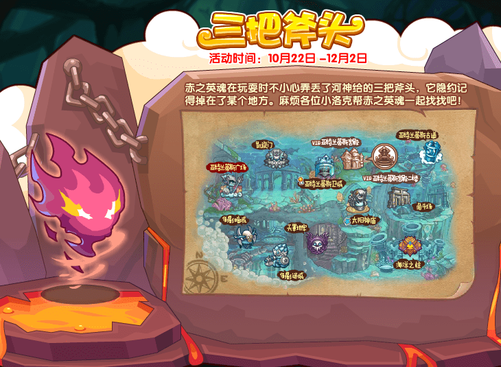 赤之英魂在玩耍时不小心弄丢了河神给的三把斧头,它隐约记得掉在了某个地方。麻烦各位小洛克帮赤之英魂一起找找吧!