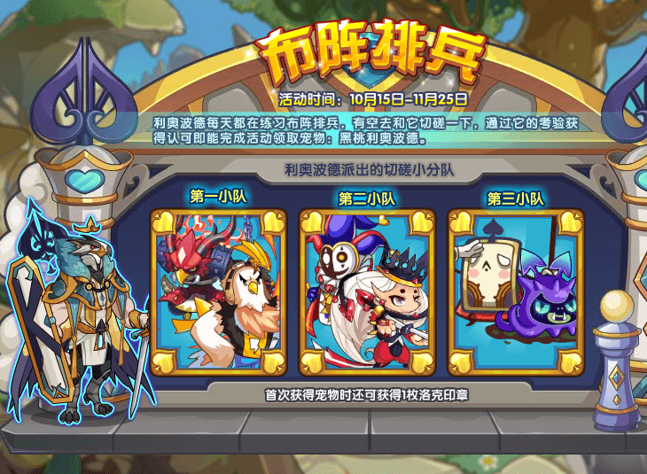 10月15日-11月25日参加【布阵排兵】活动,通过利奥波德的考验获得认可即能完成活动领取宠物:黑桃利奥波德。