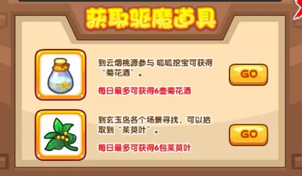 活动需要小洛克们先取得驱魔道具:茱萸叶、菊花酒,获得方式如下图所示: