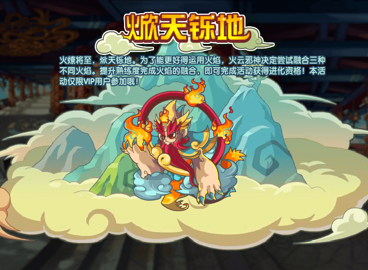 火燎将至,焮天铄地。为了能更好得运用火焰,火云邪神决定尝试融合三种不同火焰。提升熟练度完成火焰的融合,即可完成活动获得进化资格!特殊提醒:本活动仅限vip用户参加哦!