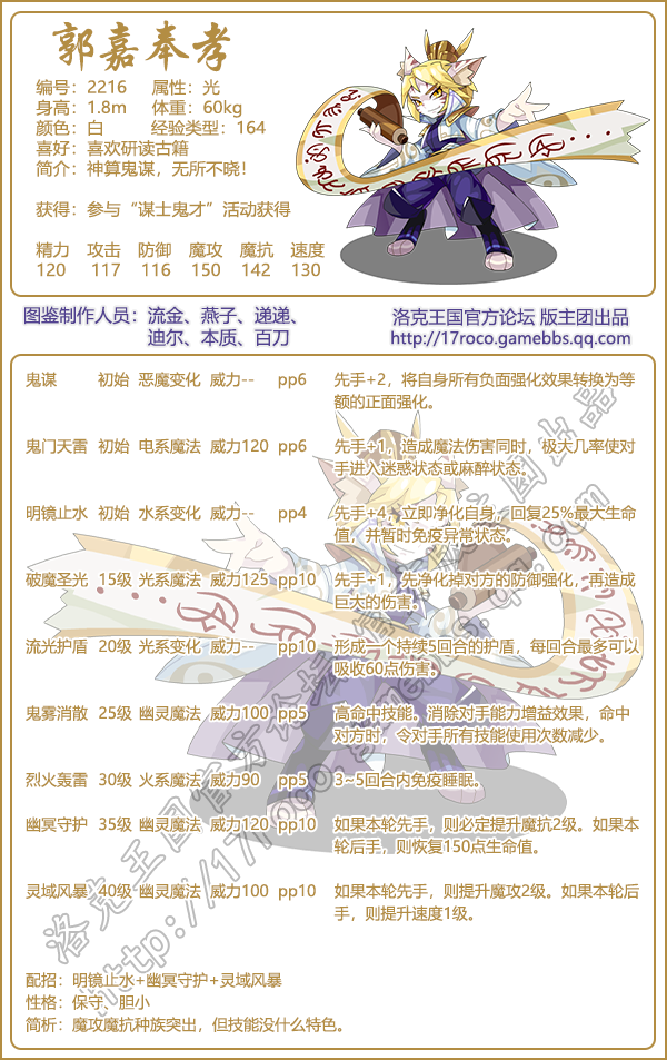 《洛克王国》是一款轻松好玩的休闲类手游,游戏中拥有海量的宠物精灵,郭嘉奉孝怎么样,厉害吗?下面手游网小编给大家带来了《洛克王国》郭嘉奉孝技能表图鉴介绍,想要知道该宠物信息的小伙伴速来围观吧!