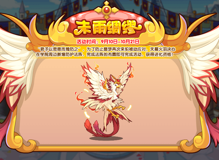“君子以思患而豫防之”,为了防止噩梦再次来犯被动应对,天幕火羽决心在学院周边新增防护法阵,完成法阵的布置即可完成活动,获得进化资格!