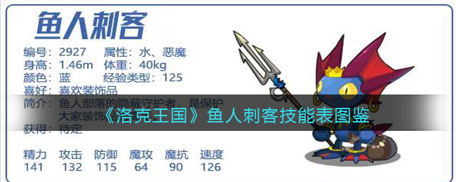 《洛克王国》是一款轻松好玩的休闲类手游,Q萌的游戏画风,玩家将被置身于一个精彩的世界中!游戏中拥有海量的宠物精灵,【鱼人刺客】是新上线的宠物,下面手游网小编给大家带来了《洛克王国》鱼人刺客技能表图鉴介绍,想要知道【鱼人刺客】信息的小伙伴速来围观吧!