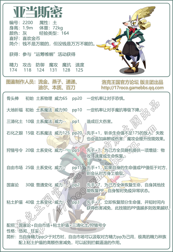 《洛克王国》是一款轻松好玩的休闲类手游,Q萌的游戏画风,玩家将被置身于一个精彩的世界中!游戏中拥有海量的宠物精灵,下面手游网小编给大家带来了《洛克王国》亚当斯密技能表图鉴介绍,想要知道【亚当斯密】信息的小伙伴速来围观吧!