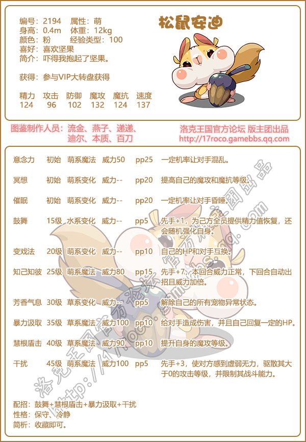 《洛克王国》是一款轻松好玩的休闲类手游,Q萌的游戏画风,玩家将被置身于一个精彩的世界中!游戏中拥有海量的宠物精灵,下面手游网小编给大家带来了《洛克王国》松鼠安迪技能表图鉴介绍,想要知道【松鼠安迪】信息的小伙伴速来围观吧!