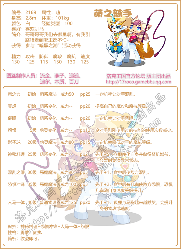 《洛克王国》是一款轻松好玩的休闲类手游,Q萌的游戏画风,玩家将被置身于一个精彩的世界中!游戏中拥有海量的宠物精灵,下面手游网小编给大家带来了《洛克王国》萌之骑手技能表图鉴介绍,想要知道【萌之骑手】信息的小伙伴速来围观吧!