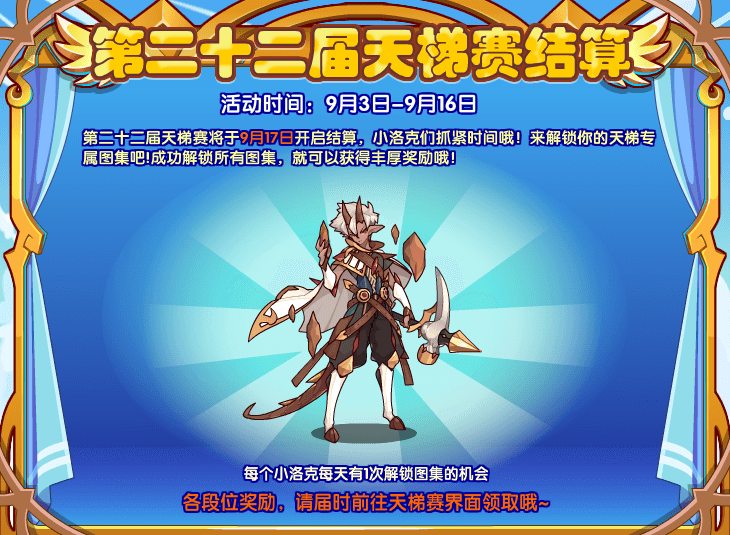 第二十二届天梯赛将于9月17日开启结算,小洛克们抓紧时间哦!来解锁你的天梯专属图集吧!成功解锁所有图集,就可以获得丰厚奖励哦!