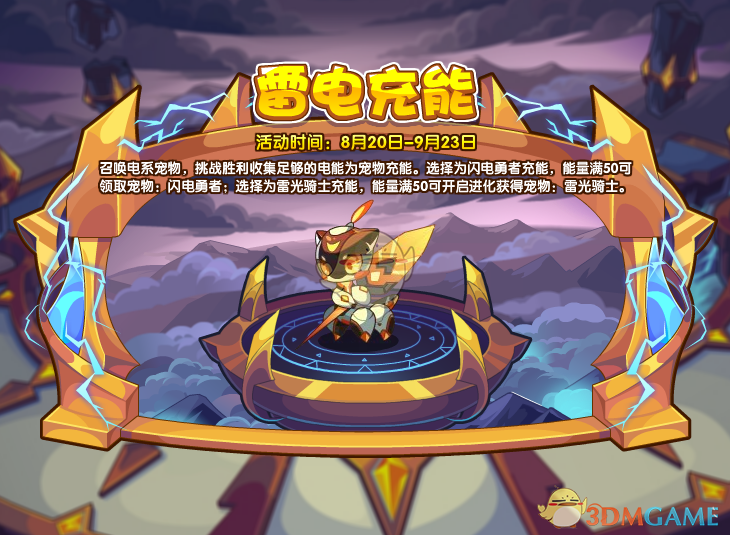 召唤电系宠物,挑战胜利收集足够的电能为宠物充能。选择为闪电勇者充能,能量满50可领取宠物:闪电勇者;选择为雷光骑士充能,能量满50可开启进化获得宠物:雷光骑士。