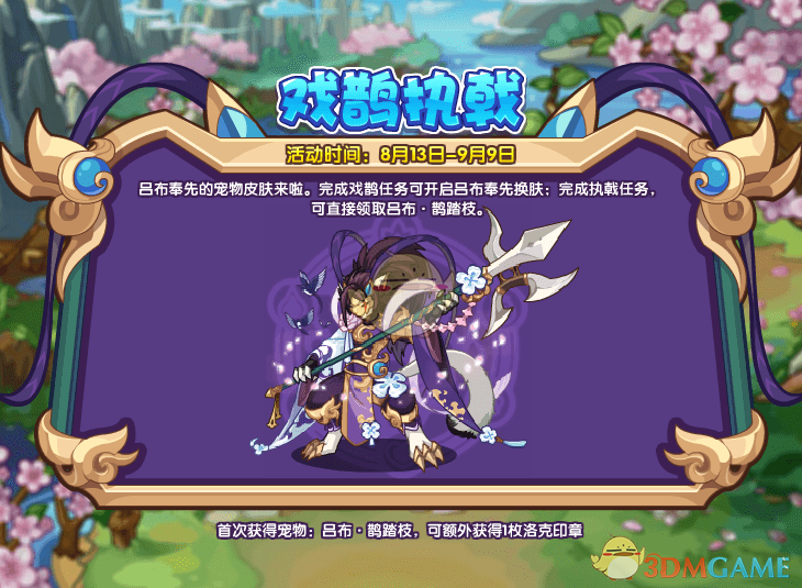 吕布奉先的宠物皮肤来啦。完成戏鹊任务可开启吕布奉先换肤;完成执戟任务,可直接领取吕布·鹊踏枝。