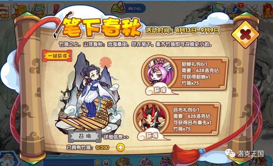 洛克王国游戏中史小韵可以通过【笔下春秋】活动获取!这里又分为两种获得方式:集齐竹简获得以及一键获得。其中通过集齐竹简获得史小韵仅限1次,一键获得的次数不限量。