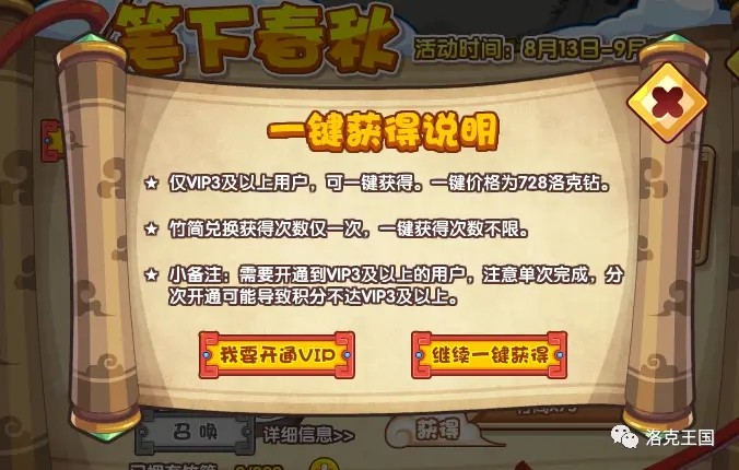 如果想通过【一键获得】方式获得史小韵,点击【一键获得】可以查看说明,本次史小韵的一键获得需要满足vip等级达到vip3及以上。