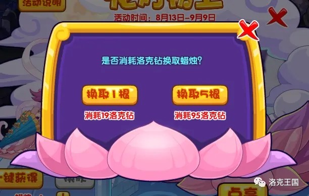 换肤方式需要点亮花灯达到一定次数才可激活,点亮花灯的前提是需要蜡烛,点击【+】可通过洛克钻换取蜡烛,每19洛克钻可换取1根蜡烛。