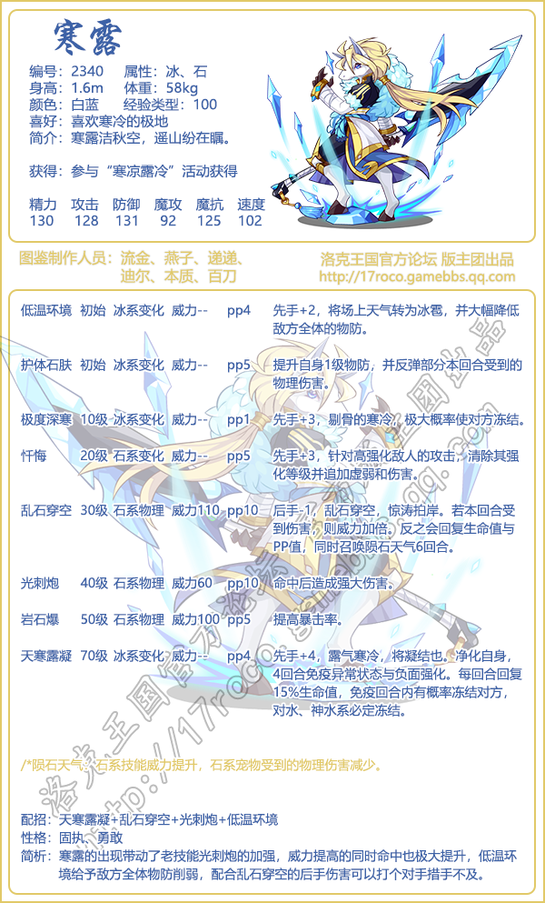 《洛克王国》寒露怎么样,厉害吗?游戏中宠物角色非常多,【寒露】宠物的技能属性是什么,该如何配招呢?下面小编就给大家带来了《洛克王国》寒露技能表图鉴介绍,一起看看吧!