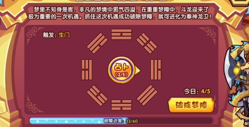 梦里不知身是客,非凡的梦境中邪气四溢,在重重梦障中,斗龙迎来了极为重要的一次机遇。抓住这次机遇成功破除梦障,即可进化为奉神龙卫!