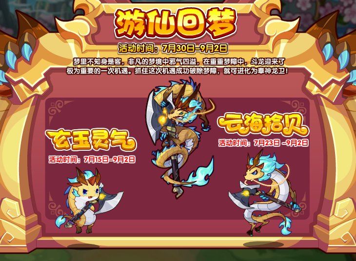 游仙回梦活动,也就是蟠龙三阶,需要占卜,每天有五次占卜机会,再破除梦障即可加进度,其中生门加的最多,用二阶里面兑换的龙涎香可以直接找到生门,一次消耗五个,对战1000+血量的奉神龙卫,无被动免控,会提升闪避和命中,会召唤化境环境,有11速控制,还有护盾。然后再进行破除梦障,对战1500+的奉神龙卫,成功一次加3点进度,占卜和破除梦障失败是会扣次数的,不要逃跑哦!累计60点破除进度即可获得进化资格!带上心爱的斗龙加油破除梦障吧!