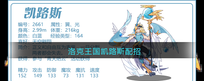 技能配招推荐使用:扶摇苍穹+浮光跃金+青天绝云+吉光片羽。洛克王国游戏中凯路斯是一个物攻宠物,带四专属就好。2021周年庆期间可以通过小生的仿真宝箱获取。
