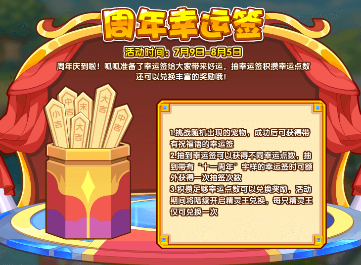 2、抽到幸运签可以获得不同幸运点数,抽到带有“十一周年字样的幸运签时可额外获得一次抽签次数