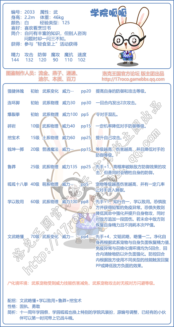 洛克王国学院呱呱性格比较推荐固执、勇敢。固执会增加10%攻击、减少10%魔攻。勇敢会增加10%攻击、减少10%速度。技能配招推荐:文武略懂+学以致用+鲁莽+挖宝术。