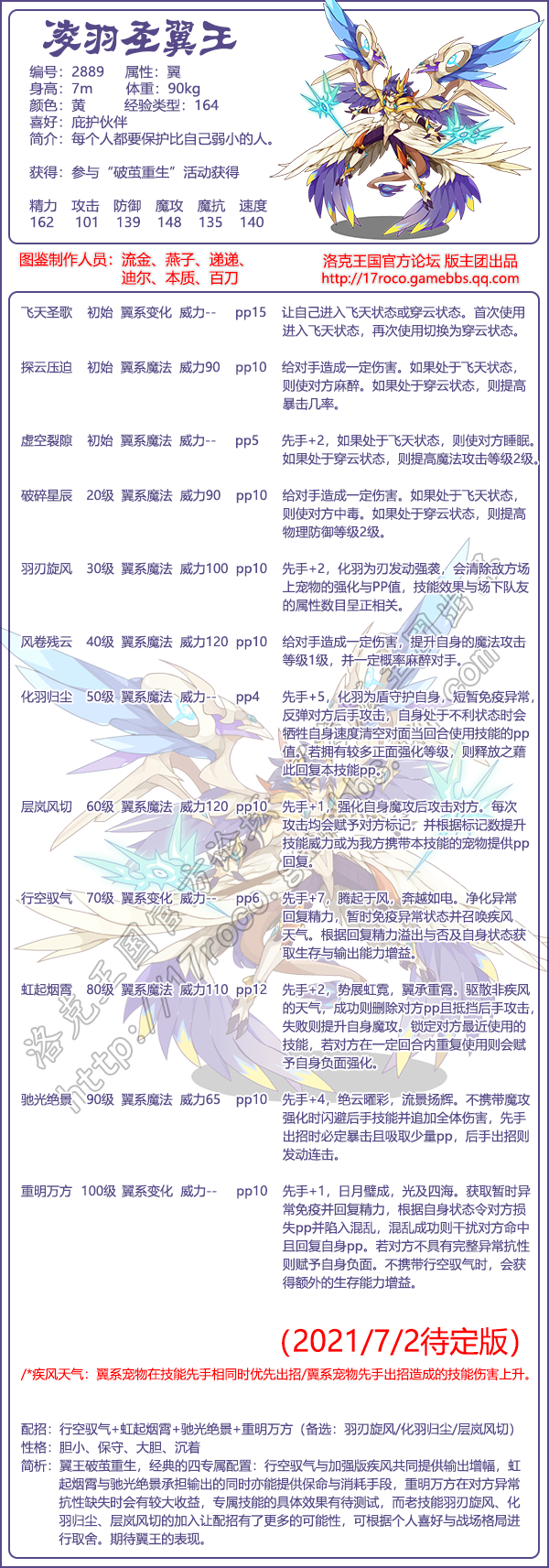 翼王破茧重生成凌羽圣翼王,技能配招推荐:行空驭气+虹起烟霄+驰光绝景+重明万方(羽刃旋风/化羽归尘/层岚风切)。性格推荐:胆小,保守,大胆,沉着。