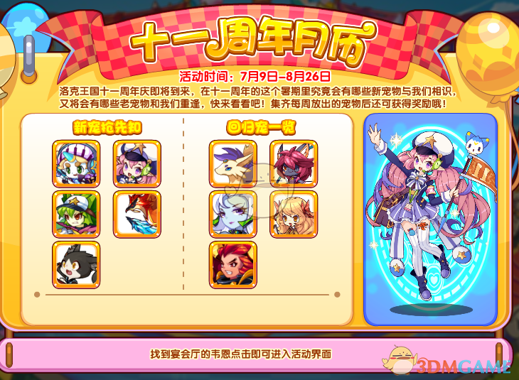 7月9日-8月26日,找到宴会厅的韦恩点击即可进入【十一周年月历】活动界面。集齐每周放出的宠物后还可获得奖励培养果实。