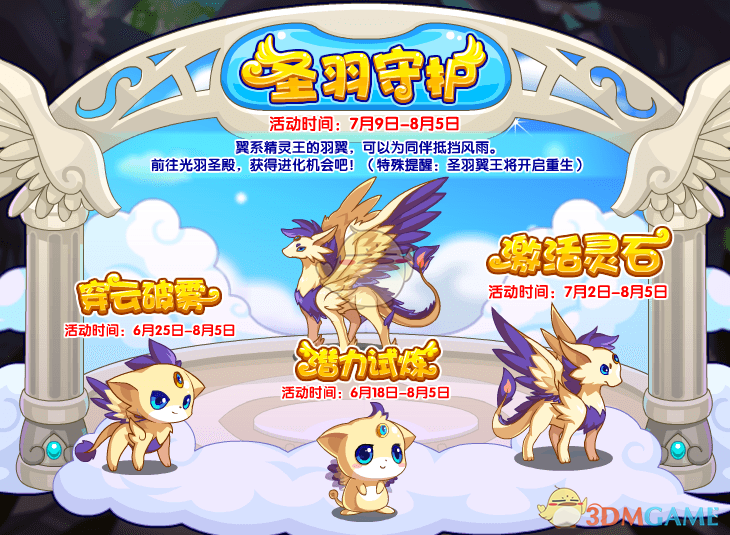 圣羽守护活动是洛克王国11周年庆——学园祭上部分活动之一,活动地图:光羽圣殿,开启时间是7月9日。帮助灵羽神卫积累足够多的圣羽,即可开启进化资格!