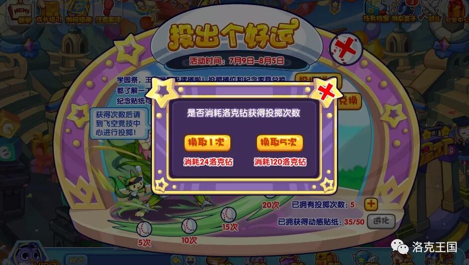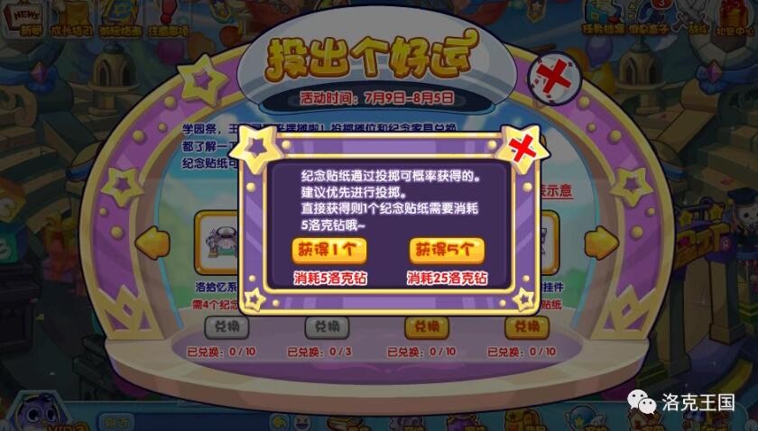 在体育场的主界面获得了投掷次数之后,去飞空竞技中心使用星星魔法投掷,可以获得纸牌下藏匿的内容,纸牌下就有几率获取纪念贴纸。另外还可以用洛克钻购买纪念贴纸,5洛克钻兑换1个。