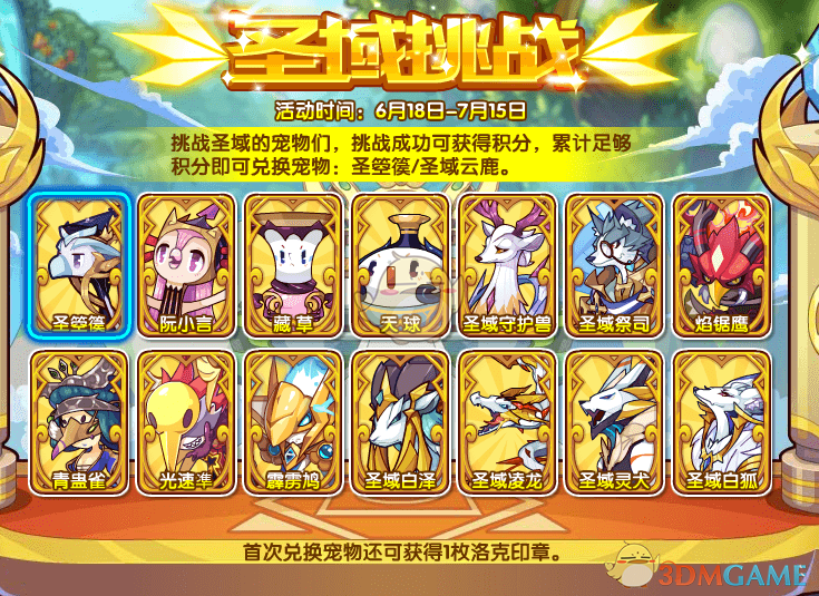 在6月18日-7月15日圣域花园,挑战圣域的宠物们,挑战成功可获得积分,累计足够积分即可兑换宠物:圣箜篌/圣域云鹿。首次兑换还可以获得一枚洛克印章。