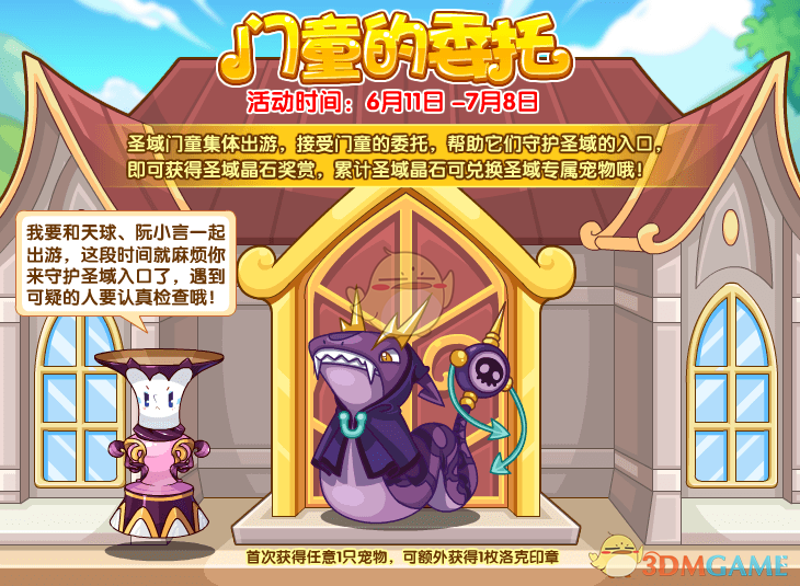 圣域门童集体出游,接受门童的委托,帮助它们守护圣域的入口,即可获得圣域晶石奖赏,累计圣域晶石可兑换圣域专属宠物哦!