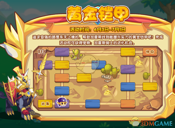 6月3日-7月1日期间,参与【黄金铠甲】活动,帮助加雷斯找到能提升实力的黄金铠甲,完成活动即可获得宠物:加雷斯骑士的进化机会。